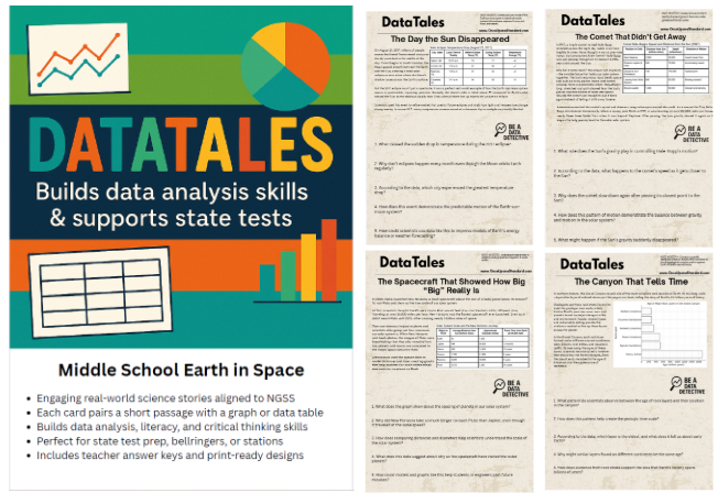 Explore the universe with DataTales: Middle School Earth in Space! Each NGSS-aligned storytelling card combines a real-world science mystery—like the day the Sun disappeared during a total eclipse or the comet that refused to leave our solar system—with authentic data and critical-thinking questions. Students analyze graphs, interpret patterns, and connect evidence to explanation as they explore gravity, motion, eclipses, scale, and the vast history of Earth and space.