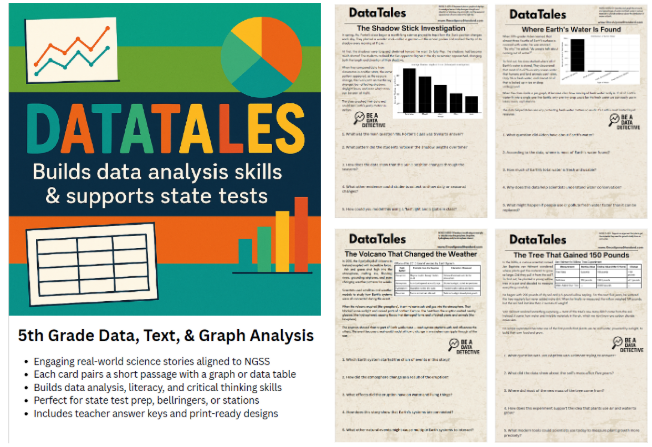 Make science storytelling come alive with DataTales: 5th Grade Science Data & Graph Storytelling Cards! Each NGSS-aligned card pairs a fascinating true science story—like exploding soda cans, shadow-tracking experiments, and trees that gained 150 pounds—with real data for students to analyze. By reading, graphing, and interpreting evidence, students practice science literacy and data skills while connecting directly to grade 5 standards in physical, life, and Earth science. Perfect for bell ringers, weekly literacy, or test prep, these ready-to-use cards turn data into discovery.