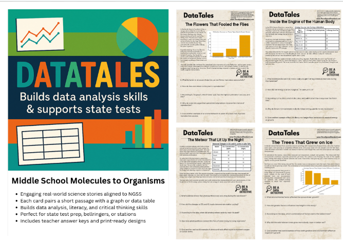 Turn data into discovery with DataTales: Molecules to Organisms! This set of NGSS-aligned science storytelling cards uses real-world mysteries—like the teen who lived with two artificial hearts and the desert flowers that trick flies—to make data analysis exciting and meaningful. Each card combines a short, engaging story with a graph or data table and critical thinking questions, helping middle school students connect evidence to explanation while building science literacy and data skills.