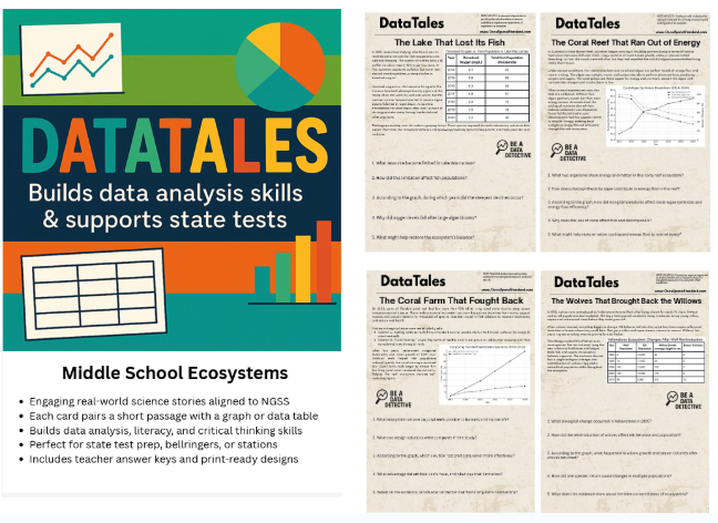 Bring ecosystems to life with DataTales: Middle School Ecosystems! Each NGSS-aligned card tells a fascinating, true science story—like wolves transforming Yellowstone or coral farms rebuilding reefs—paired with real-world data for students to interpret. Perfect for test prep or daily literacy practice, these storytelling cards make data analysis engaging, meaningful, and unforgettable.