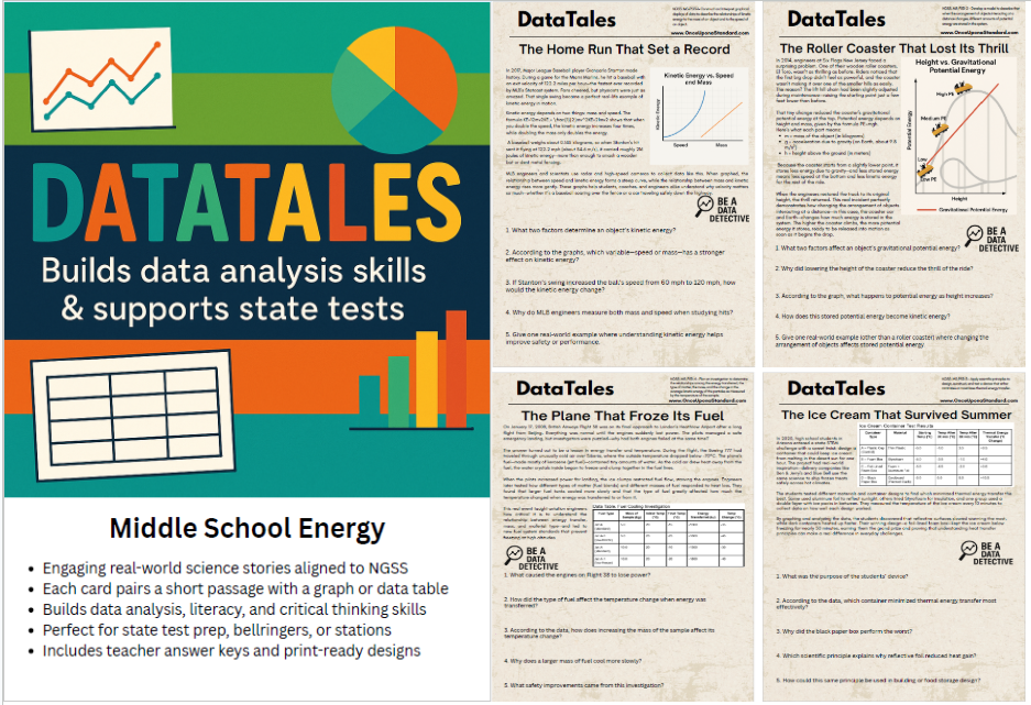 Bring energy concepts to life with the DataTales: Middle School Energy Set! Each card features a real-world science story—like record-breaking home runs, frozen airplane fuel, or meteors lighting up the night—paired with a data table or graph for students to analyze. These engaging, print-ready activities build data literacy, critical thinking, and test readiness while connecting directly to your science standards. Perfect for bellringers, warm-ups, or lab extensions!