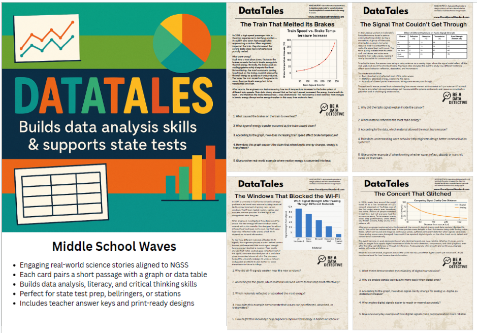 Make waves meaningful with the DataTales: Middle School Waves Set! Each card features a real-world science story—like earthquakes, Wi-Fi interference, or photos beamed from Mars—paired with a graph or data table for students to analyze. These engaging, print-ready lessons help students connect wave behavior to real technology while strengthening data, literacy, and test-ready science skills. Perfect for bellringers, warm-ups, or STEM stations!
