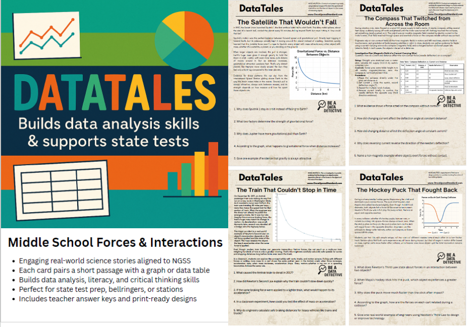 Bring physics to life with the DataTales: Middle School Forces & Interactions Set! Each card features a real-world story—like rockets launching, trains braking, or satellites orbiting Earth—paired with a graph or data table for students to analyze. These engaging, print-ready activities build data literacy, critical thinking, and test-ready science skills while connecting directly to your standards. Perfect for bellringers, warm-ups, or small-group investigations!